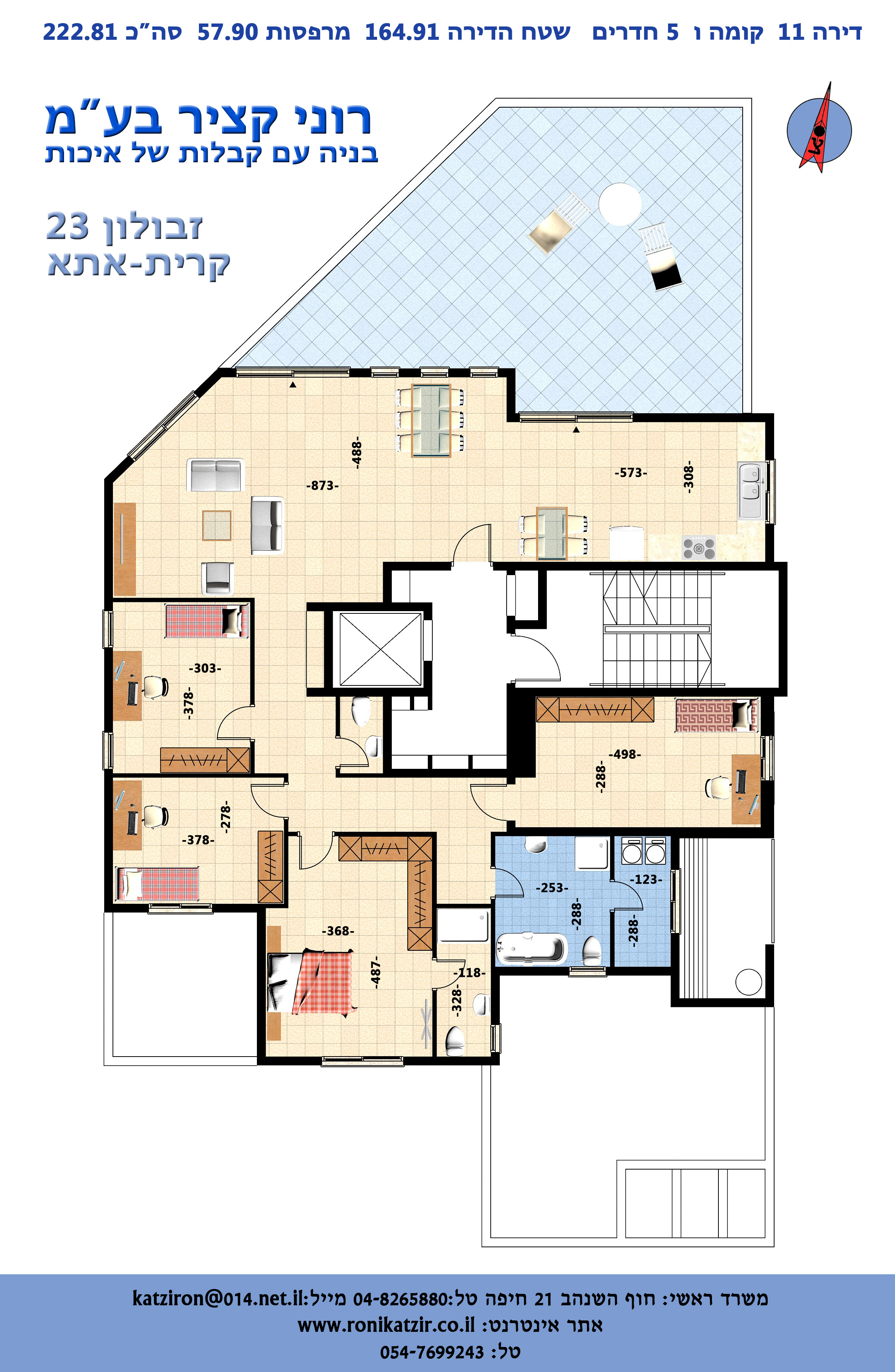 במבנה 6 קומות מגורים, בכל קומה 2 דירות, אחת 4 חדרים ואחת 5 חדרים. בקומה העליונה פנטהאוז 5 חדרים.